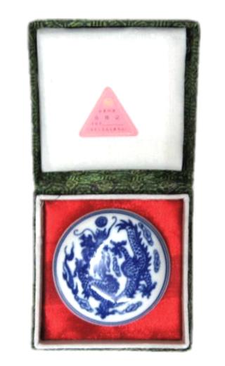 A porcelain container of high quality red Chinese red seal ink packaged in a silk brocade box. This product is suitable for professional use by artists or anyone requiring a better quality ink paste.