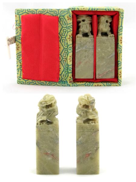 A pair of Chinese seal stones featuring a Foo dog on the top, these seal stones come in a variety of natural colors and the picture only represents the style, your stone color may vary.